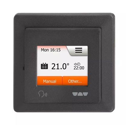Regulátor teploty volitelně řídí teplotu povrchu nebo pokojovou teplotu podle časového plánu. Součástí dodávky je jedno rezervní čidlo.