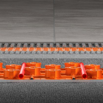 Schlüter-BEKOTEC-EN-FTS je potěrová deska s výlisky z tlakově stabilní hlubokotažné polystyrénové fólie, která je na spodní straně opatřena kročejovou izolací o tloušťce 5 mm. Zkosené výlisky udržují definovaný rozestup potrubí (rastr 50 mm). BEKOTEC desky se spojují překrytím jedné řady do sebe navzájem zapadajících výlisků. Dodržením minimální krycí vrstvy 8 mm (max. 20 mm), použitím běžného potěru nebo potěru na bázi síranu vápenatého ( pevnost v tlaku C20-C35 / pevnost v tahu za ohybu F4 max. F5) a topného potrubí BEKOTEC-THERM-HR trvale zamezíte vzniku trhlin v dlažbě z keramiky nebo přírodního kamene.