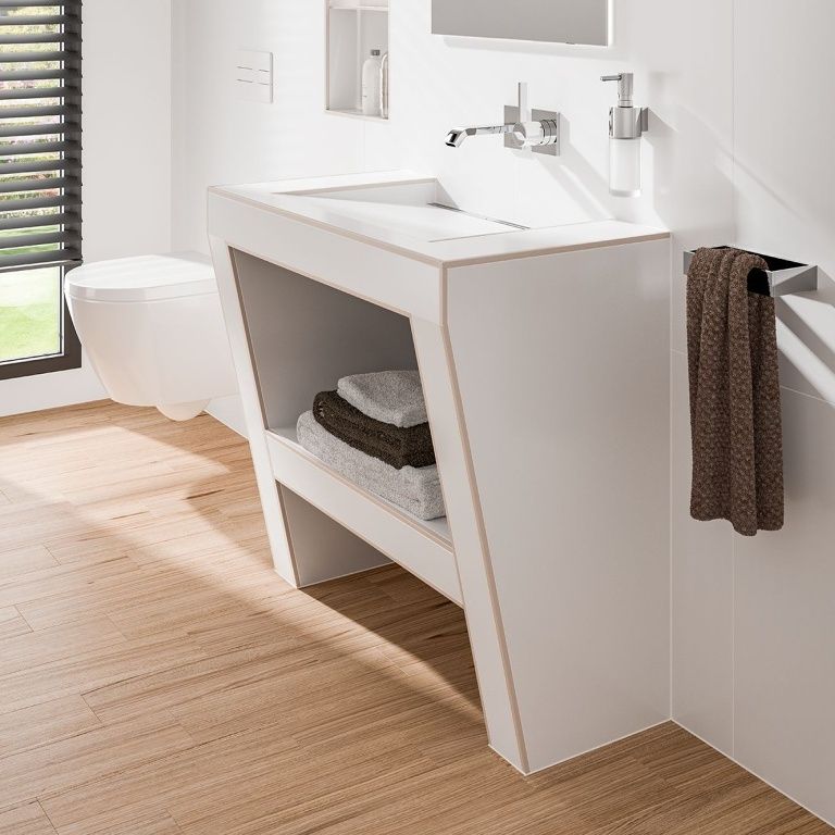 Schlüter-KERDI-BOARD-W je prefabrikovaný vestavný prvek pro vytvoření samostatného umyvadla s odkládací plochou pro přívod vody pomocí přívodní armatury pro montáž na stěnu. Je vyrobený z multifunkčního podkladu pro pokládku obkladů a dlažeb Schlüter-KERDI-BOARD lze jej přímo obkládat obklady a dlažbou do tenké vrstvy lepidla.
