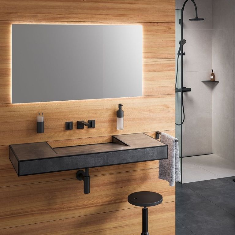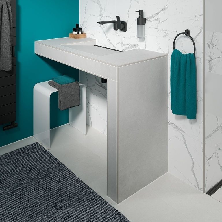 Lze jej individuálně a snadno přizpůsobit místním podmínkám: volně zavěšený pomocí volitelně dostupných nástěnných konzolí, nejlépe ve výklencích a rozích stěn, nebo pomocí nožiček z 50 mm KERDI-BOARD.