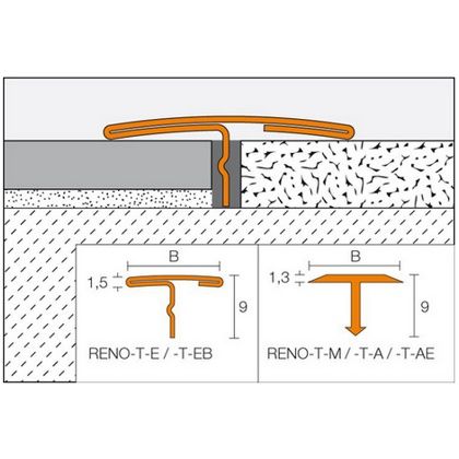 Schlüter-RENO-T je profil ve tvaru T, který se používá pro dodatečné vytvoření přechodu mezi sousedícími, stejně vysokými podlahovými krytinami (např. mezi keramickou nebo kamennou dlažbou a parketami, betonovou dlažbou, PVC, laminátem, atd.). Spára mezi sousedícími krytinami se nejprve vyplní montážním lepidlem Schlüter-KERDI-FIX nebo rovnocenným materiálem, do kterého se upevní profil Schlüter-RENO-T. Pak se svislé rameno přechodového profilu vtlačí do spáry.