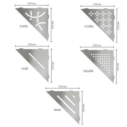 Nástěnný odkládací systém volitelně z kartáčované ušlechtilé oceli nebo z hliníku s kvalitním práškovým lakováním - v designech FLORAL, CURVE, PURE, SQUARE a WAVE. Lze jej použít jako odkládací plochu na všech stěnách s keramickým obkladem (např. ve sprchách, na obložených plochách kuchyňských linek).