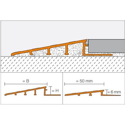 Hliníkový matně eloxovaný speciální profil pro plynulé spojení různě vysokých podlahových krytin, např. v místě přechodu dlažby na koberec.