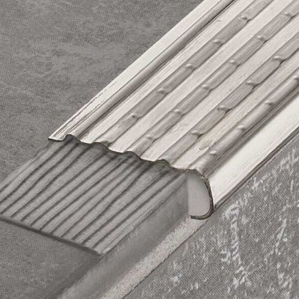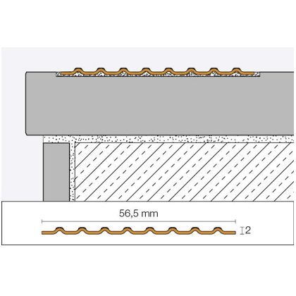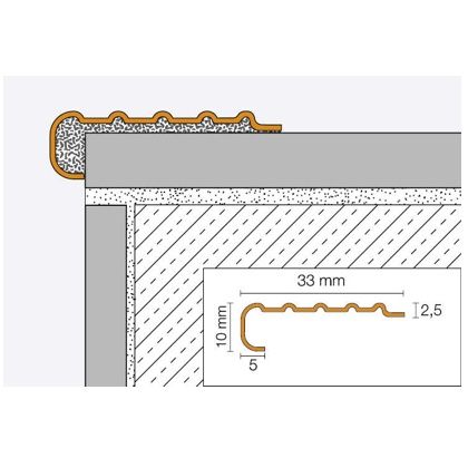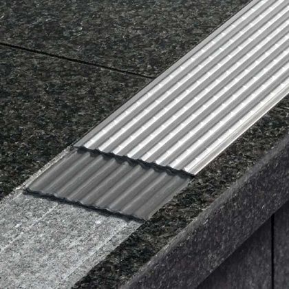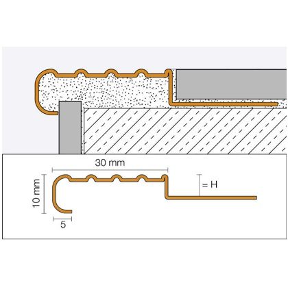 Schlüter-TREP-EFK je varianta bez kotevního ramene a bez ochrany hran se speciálním protiskluzovým profilováním. Lze jej osadit do příslušného vyfrézovaného vybrání nebo dodatečně na stupnice schodů.