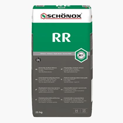 Používá se k vyrovnávání a špachtlování s vysokým náběhem pevností, bez smrštění. Vhodná pro rychlé opravy betonových ploch, schodů, pro vytvoření nájezdů a pro přímé lepení krytin ve vnitřním prostředí. Po smíchání 5,5 l vody s 25,0 kg prášku je malta SCHÖNOX RR připravená k použití. Klasifikace: CT-C25-F7. GISCODE ZP1 - výrobek obsahuje cement, s nízkým podílem chromu.