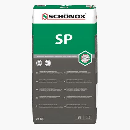 Vhodná na všechny sádrové a cementové podklady ve vnitřním prostředí. SCHÖNOX SP se vyznačuje velmi malým smršťováním. Po smíchání 6,5 l vody s 25,0 kg prášku je stěrka SCHÖNOX SP připravená k použití. Klasifikace: CT-C35-F7. Ekologický výrobek s velmi nízkým podílem emisí EC 1PLUS bez vlivu na zdraví řemeslníků i budoucích uživatelů.