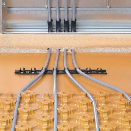 Vyrovnávací deska Schlüter-BEKOTEC-ENFGI 30 s tepelnou a kročejovou izolací se používá před rozdělovači topných okruhů pro zjednodušení montáže topného potrubí ve skříni rozdělovače.