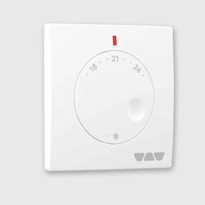 Požadovanou teplotu lze nastavit od 8° do 30°C a lze ji omezit omezovačem požadované hodnoty, který je pod volicím kotoučem. Časově řízené snížení teploty o 4°C lze provádět časovačem na základním modulu „Control“. Prostorové čidlo je provozováno s bezpečným malým napětím DC 5 V (SELV) přes základní modul „Control“ ve spojení s modulem pro připojení prostorových čidel. Provozní stav „topení / chlazení“ indikuje „červená/modrá“ barva LED.